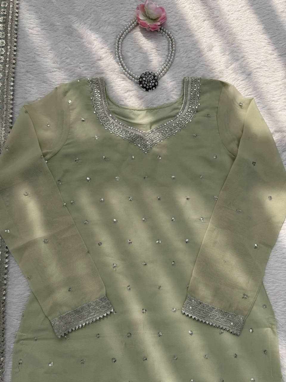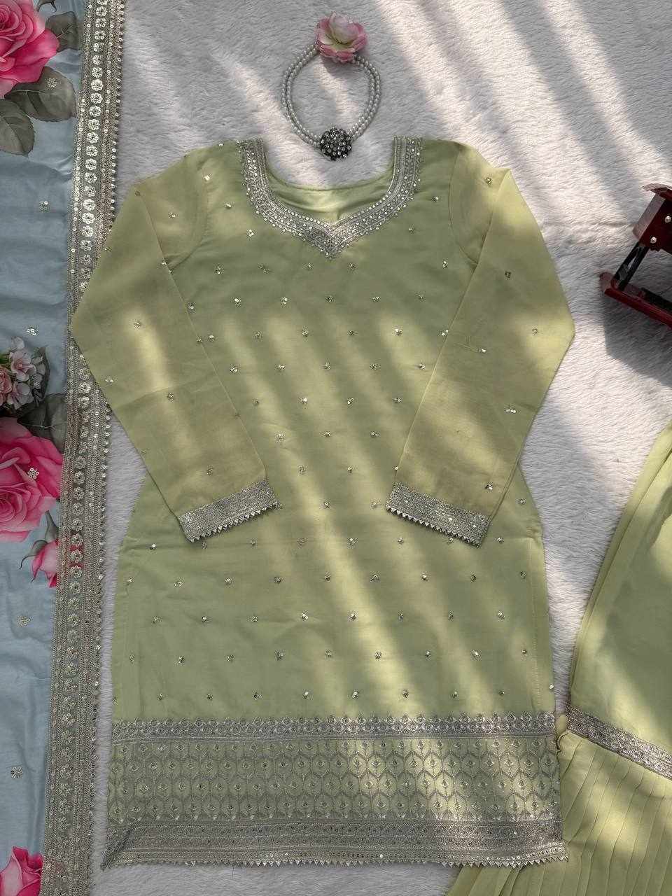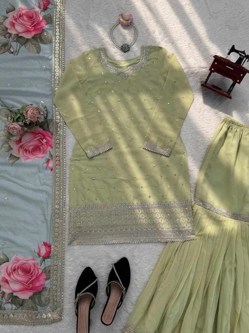 Elegant Sharara Suit Set crafted in heavy faux georgette with beautiful thread and sequence embroidery. Paired with a stylish Tibby silk dupatta, perfect for festive wear, parties, weddings, and special occasions.
