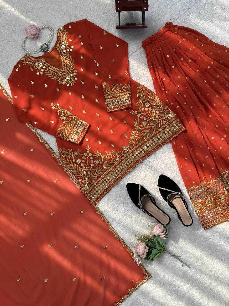 Stylish Sharara Suit Set crafted in heavy faux georgette with beautiful 9MM sequence and thread embroidery work. A perfect outfit for festive celebrations, parties, weddings, and special occasions, offering both elegance and comfort.