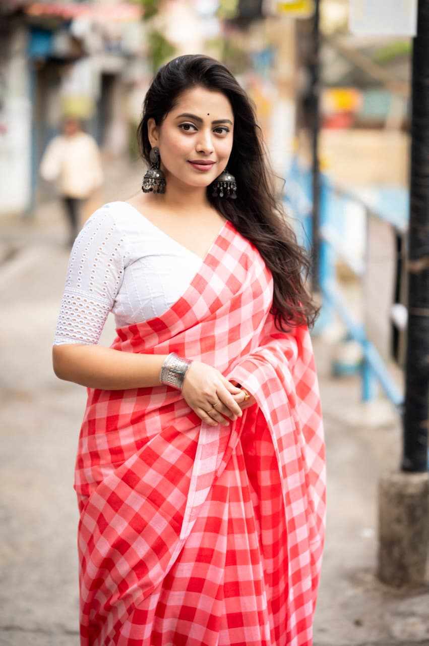 Quality- soft linen saree with trendy chex print design.