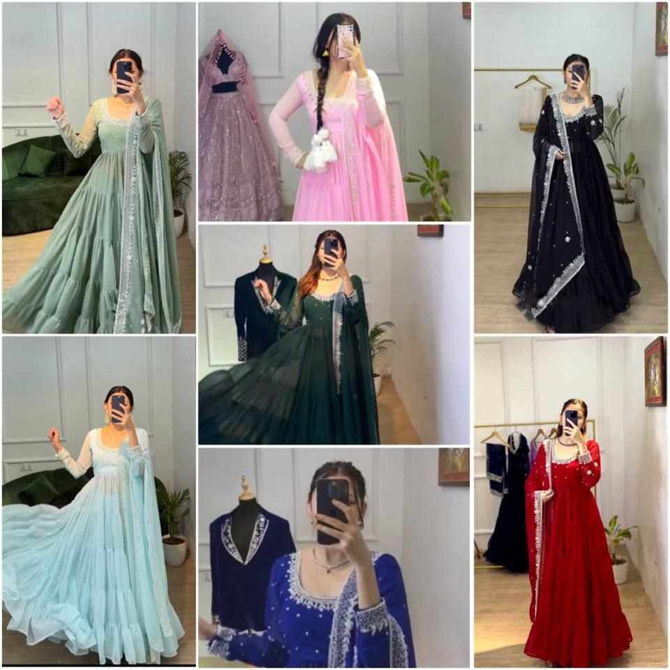 *Top Fabric*:Heavy Georgette With *Embroidery Sequence Work and Rivet Moti Work With attached Pad With Sleeve and *Fully 8 Meter Ruffle Flair*