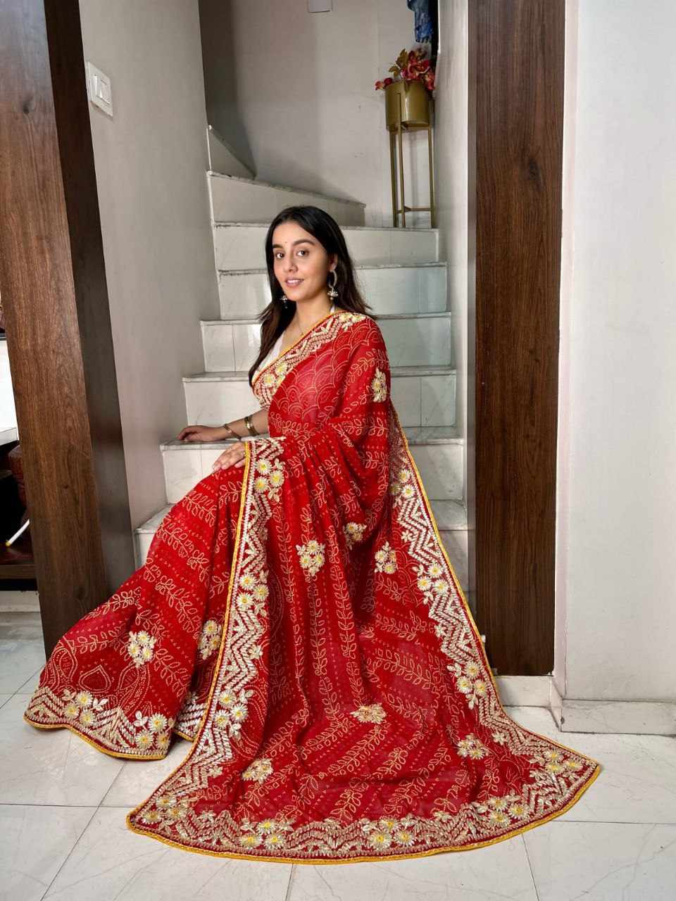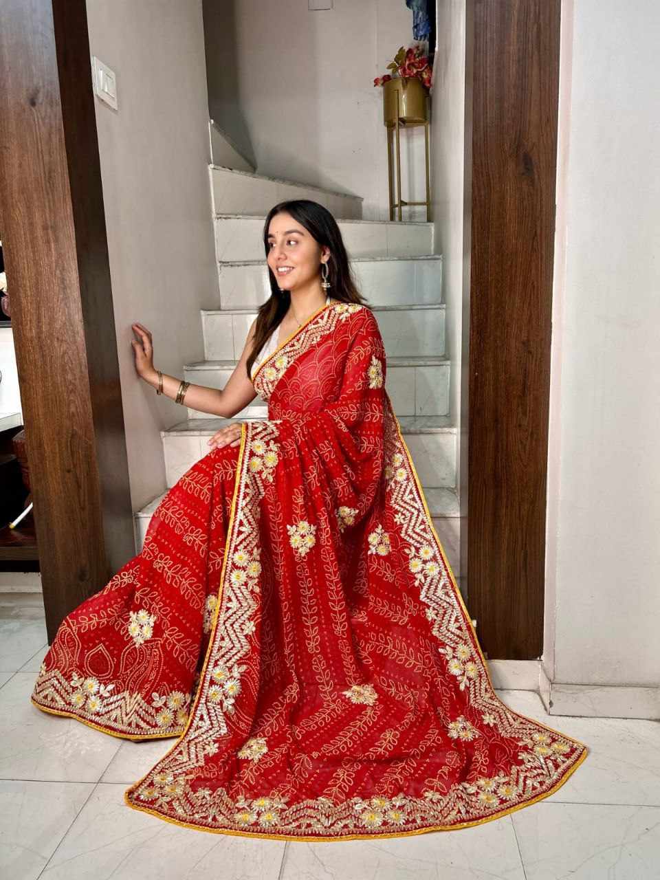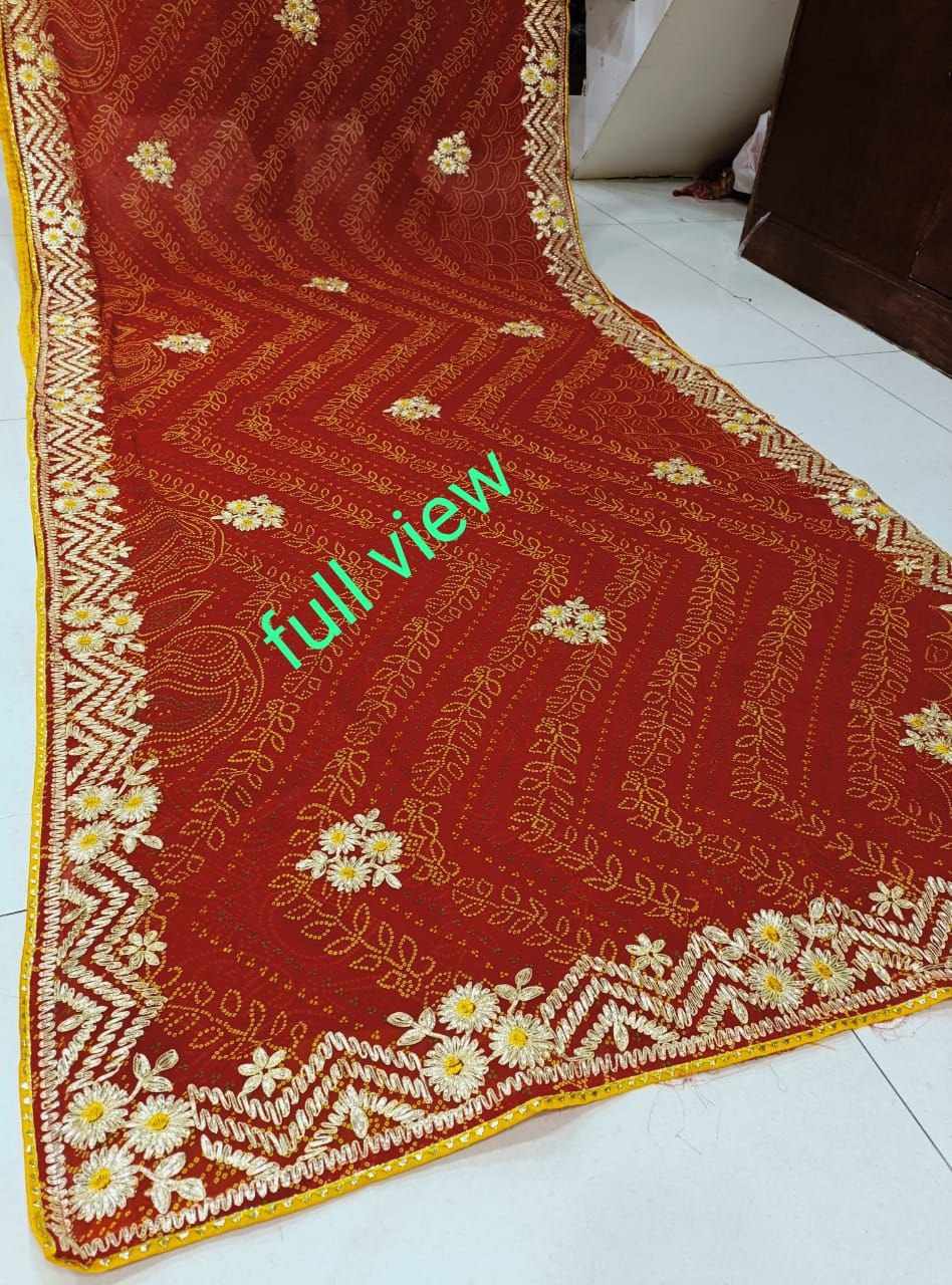 *HEAVY FOX GEORGETTE BANDHNI PRINT ALL OVER IN SAREE WITH BEAUTIFUL GOTA RIBBON C-PALLU WORK IN FULL SAREE WITH CONTRAST YELLOW COLOUR KAJU KATLI LACE & MONO BANGLORI BLOUSE .80*