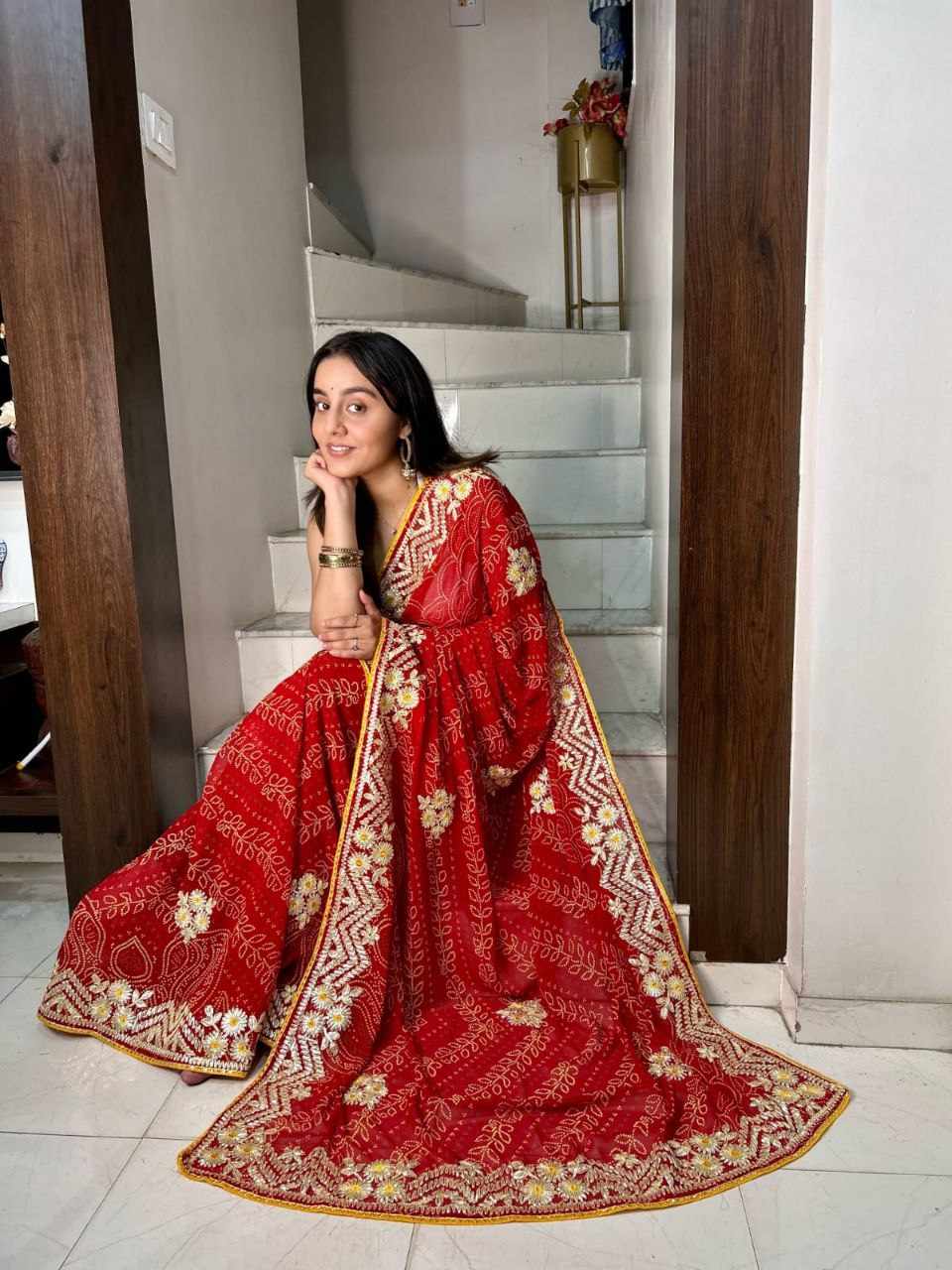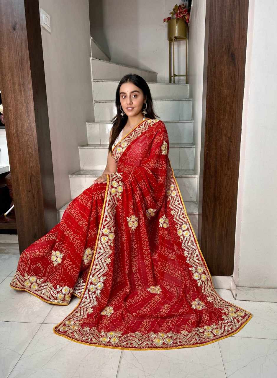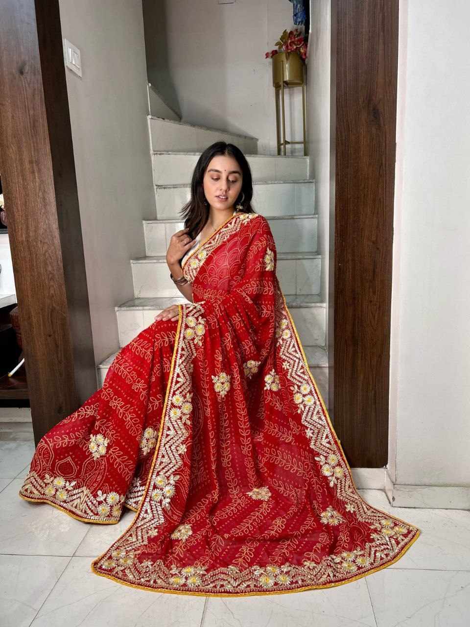 *HEAVY FOX GEORGETTE BANDHNI PRINT ALL OVER IN SAREE WITH BEAUTIFUL GOTA RIBBON C-PALLU WORK IN FULL SAREE WITH CONTRAST YELLOW COLOUR KAJU KATLI LACE & MONO BANGLORI BLOUSE .80*