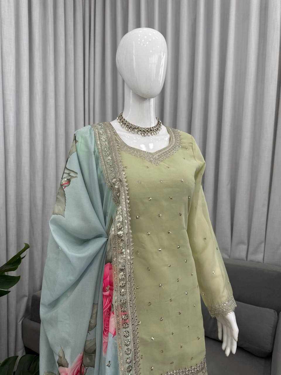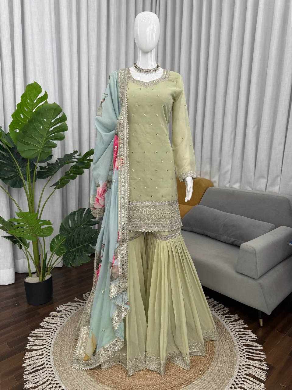 Elegant Sharara Suit Set crafted in heavy faux georgette with beautiful thread and sequence embroidery. Paired with a stylish Tibby silk dupatta, perfect for festive wear, parties, weddings, and special occasions.