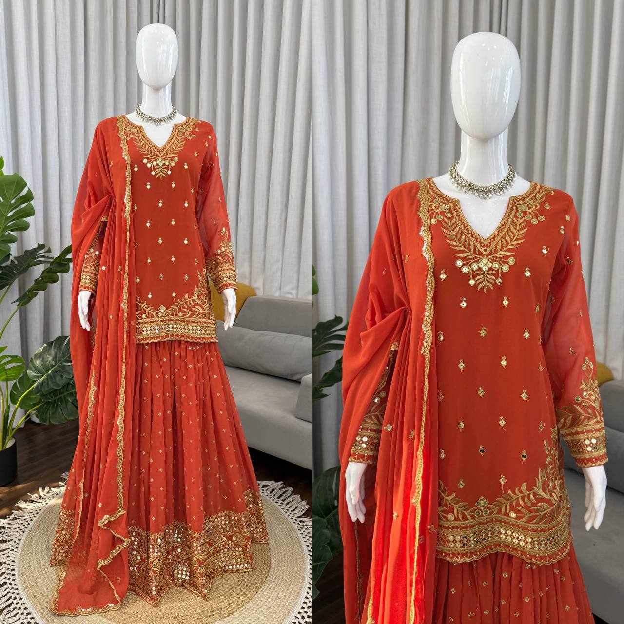 Stylish Sharara Suit Set crafted in heavy faux georgette with beautiful 9MM sequence and thread embroidery work. A perfect outfit for festive celebrations, parties, weddings, and special occasions, offering both elegance and comfort.