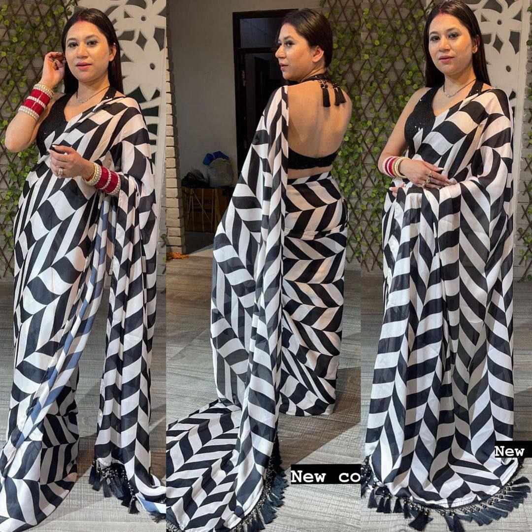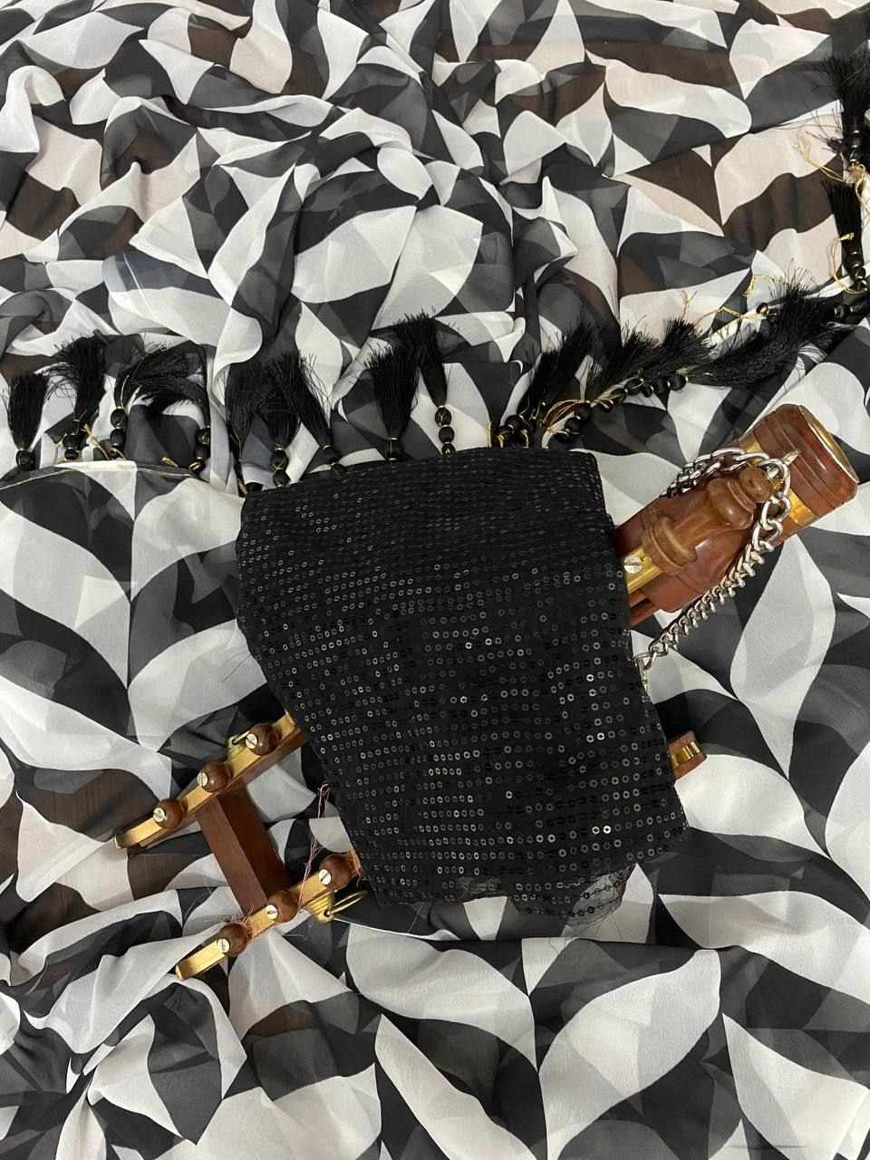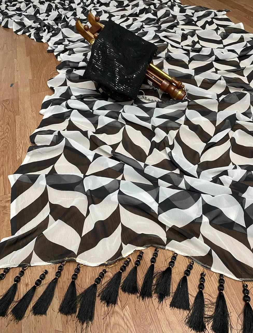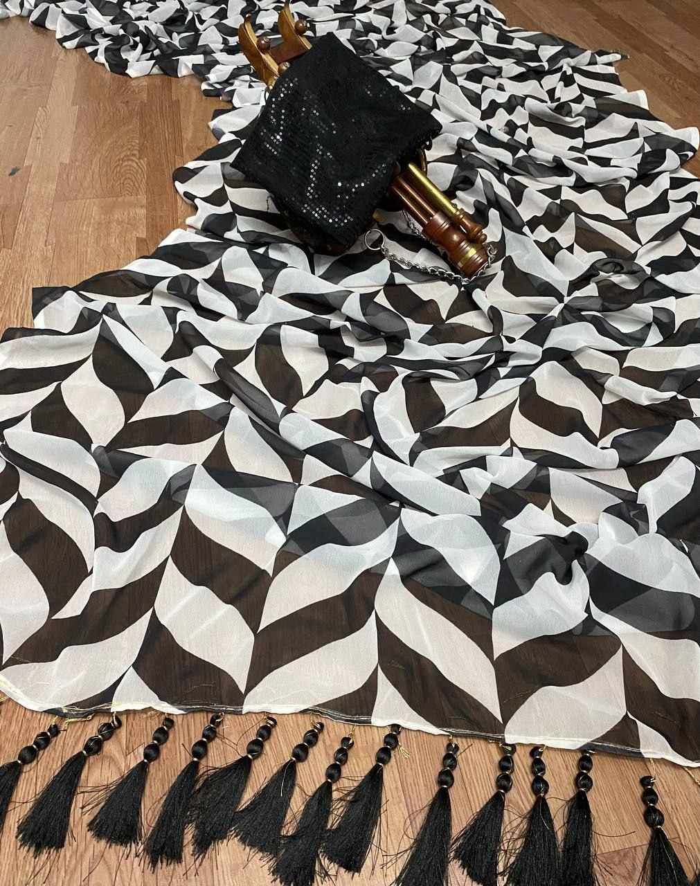 Leriya design print work in full saree with matching running Sequence blouse with *tussel work on pallu border*