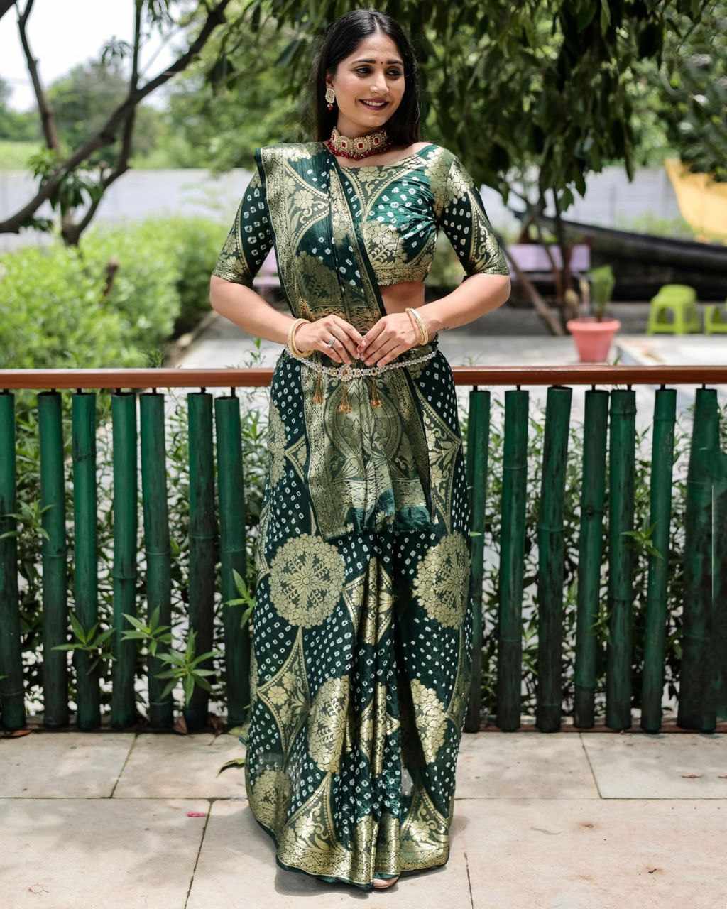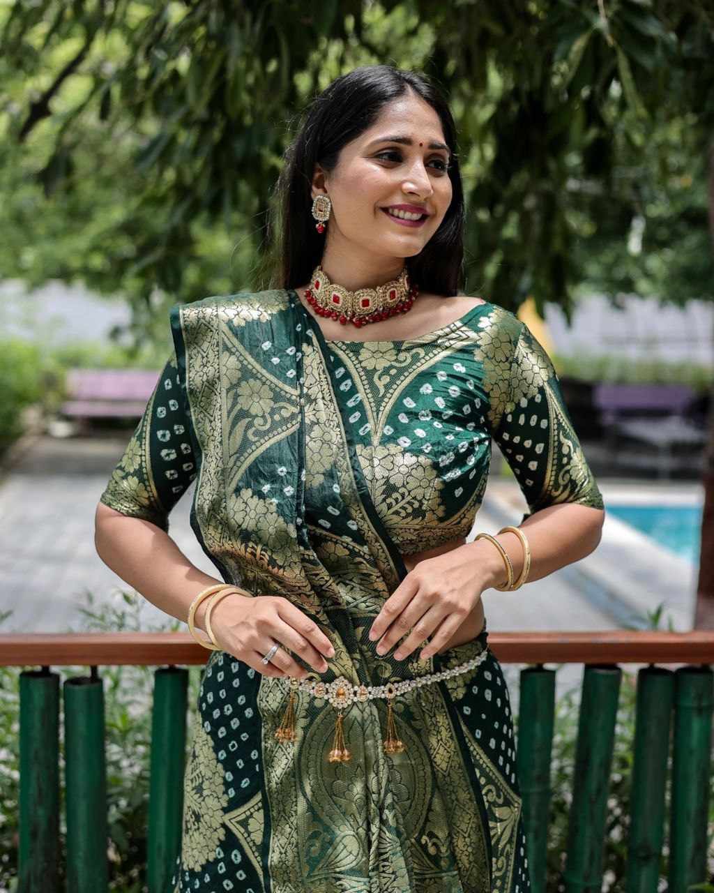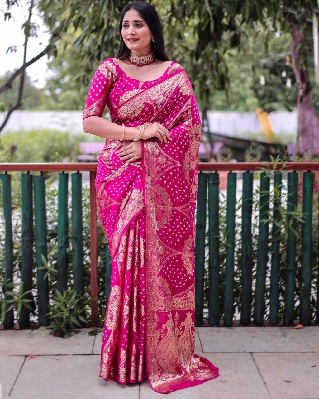 *Pure Gharchola Bandhej silk with Lagdi patta* saree made by *original Bandhej with zari weaving Border with Bandhej Rich * saree with beautiful design and having a Small broad border.