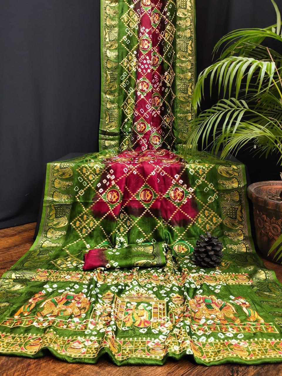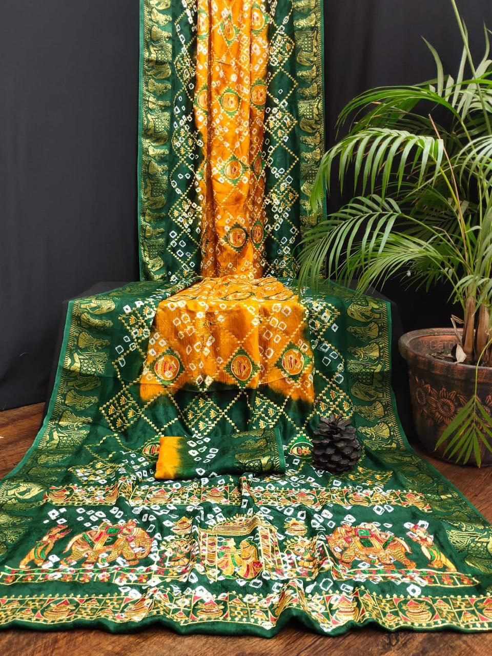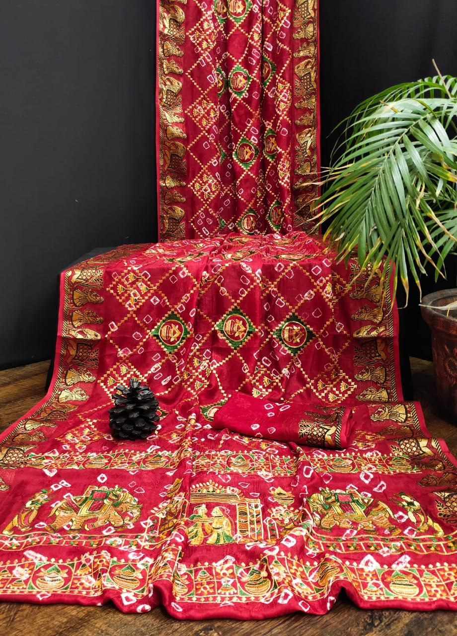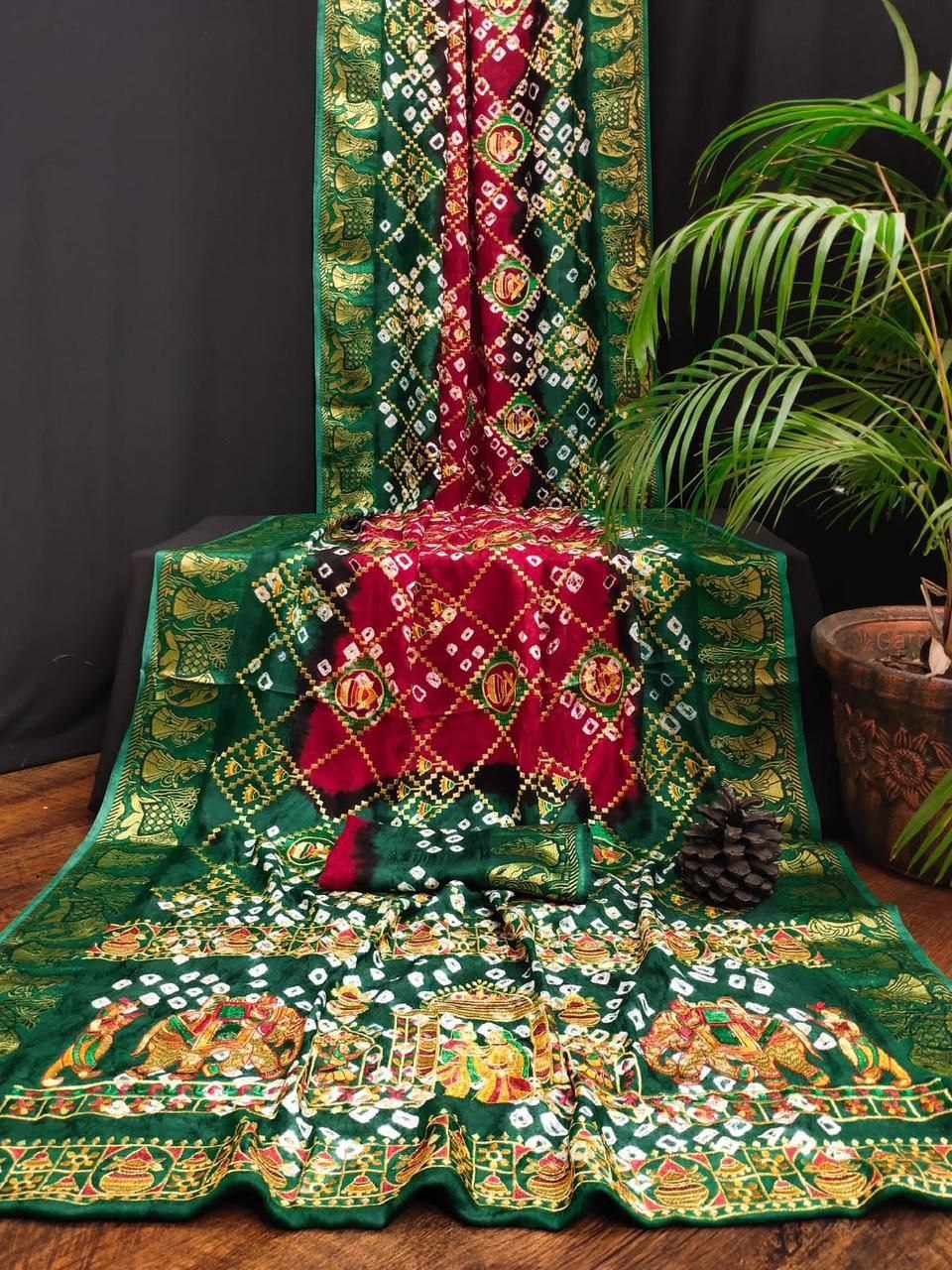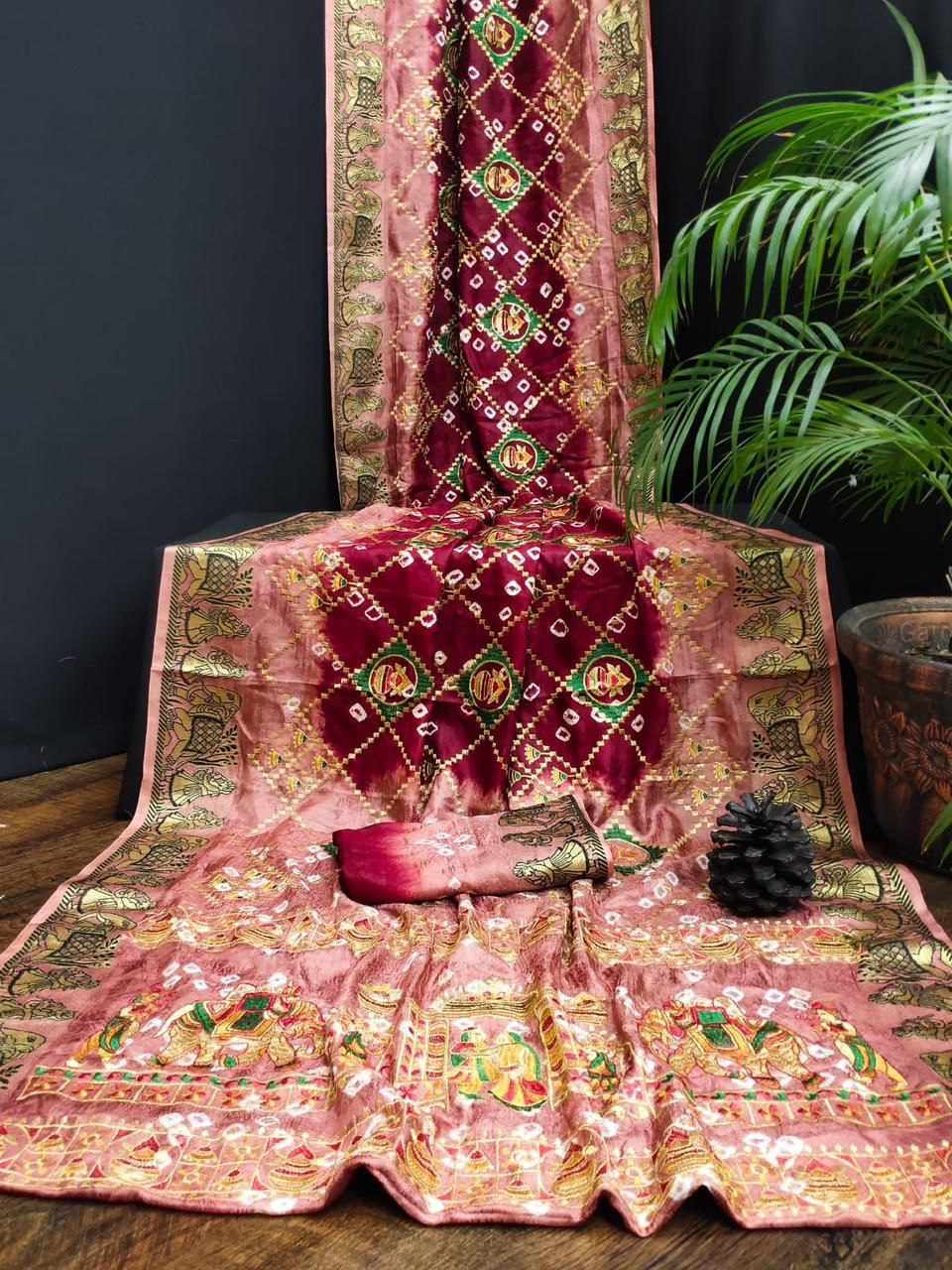 *Pure Bandhej silk* saree made by *original Bandhej with zari weaving Border with Zari Embroidery work Rich Pallu * saree with beautiful design and having a big broad border.