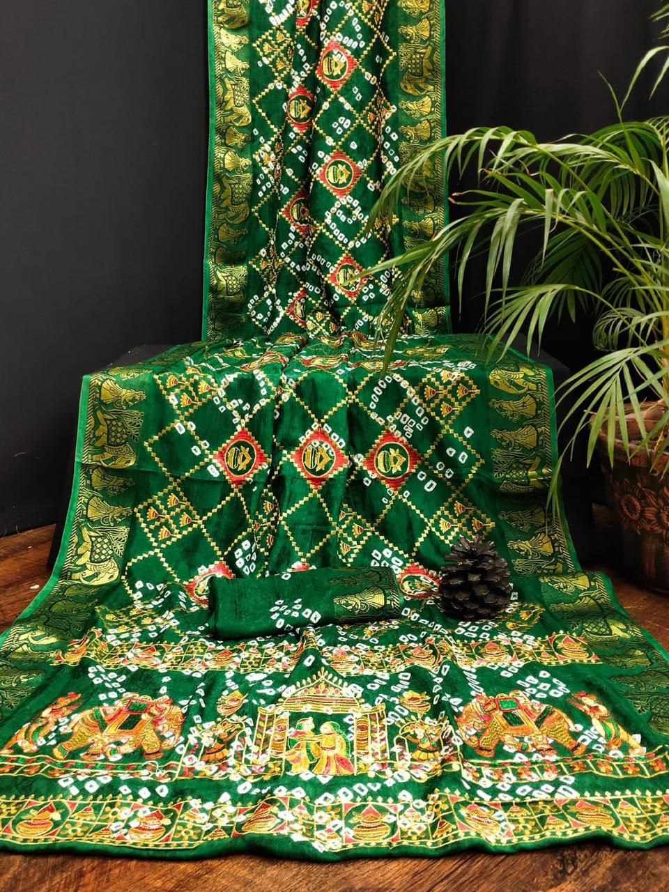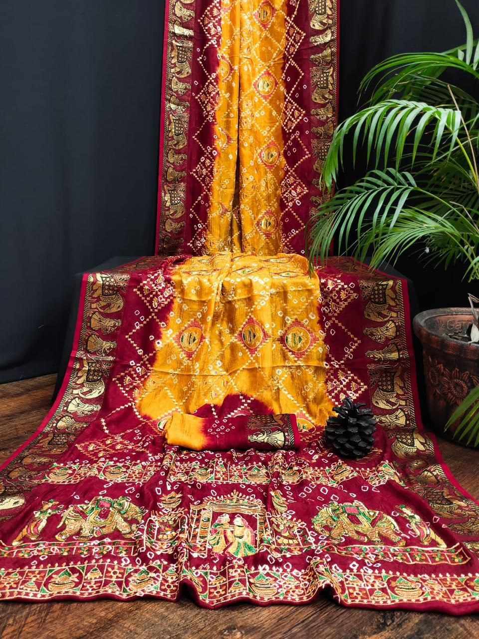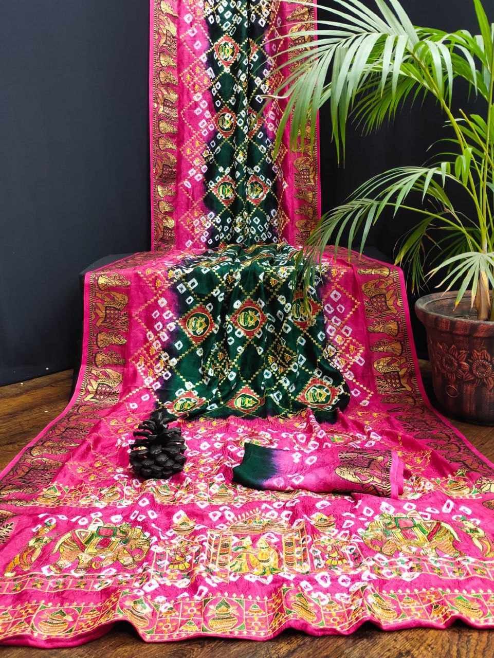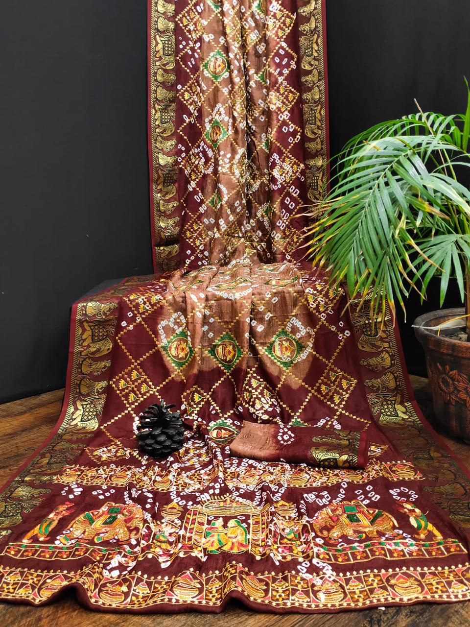 *Pure Bandhej silk* saree made by *original Bandhej with zari weaving Border with Zari Embroidery work Rich Pallu * saree with beautiful design and having a big broad border.