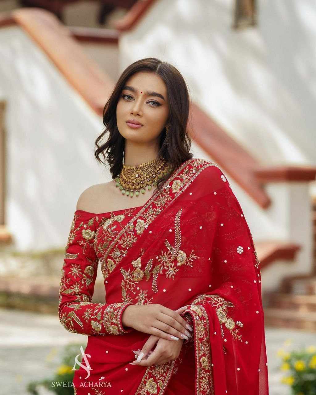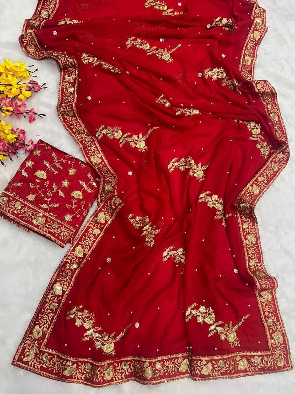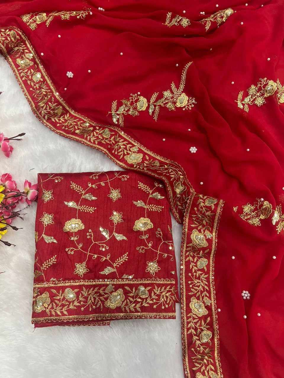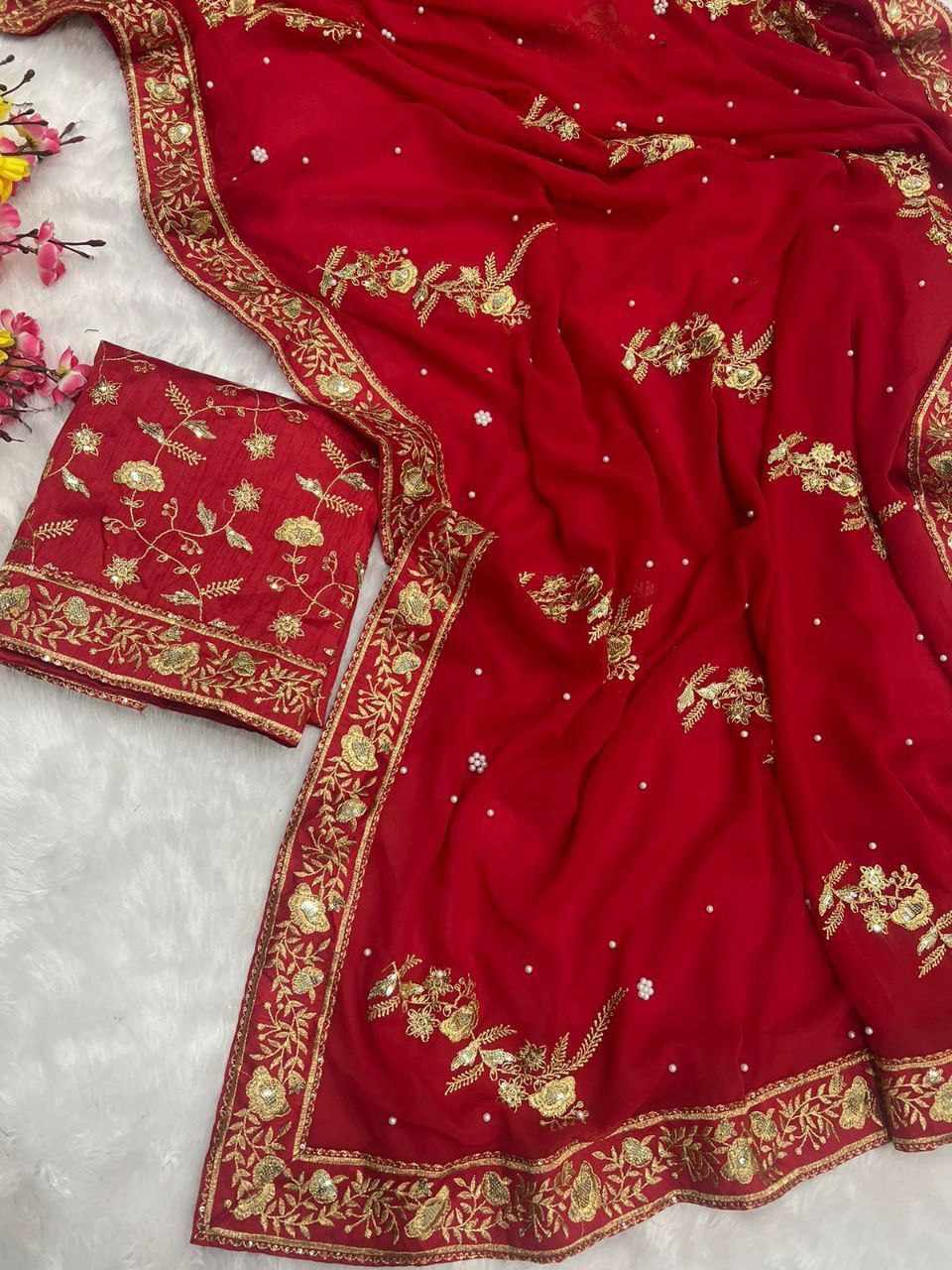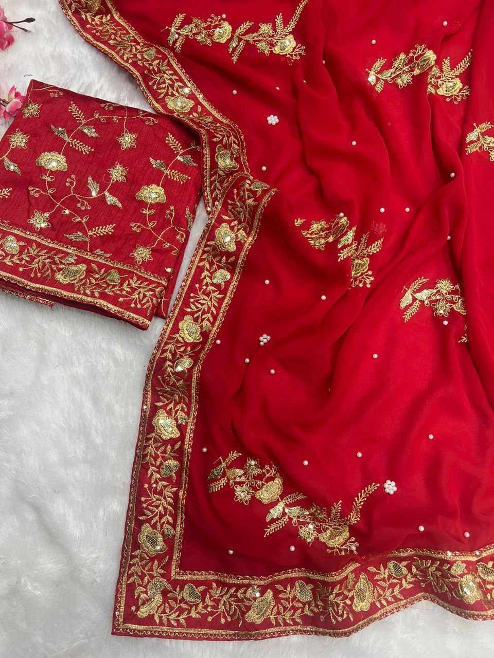 *SAREE EMBRACE THE GLEAMING AFFAIR OF OUR ALL NEW GEORGETTE EMBROIDERY COLLECTION THE SAREE IS HUED IN RED WITH CONTRACT BLOUSE RADIATING A VIBE OF FEMININITY AND GLAMOUR.*