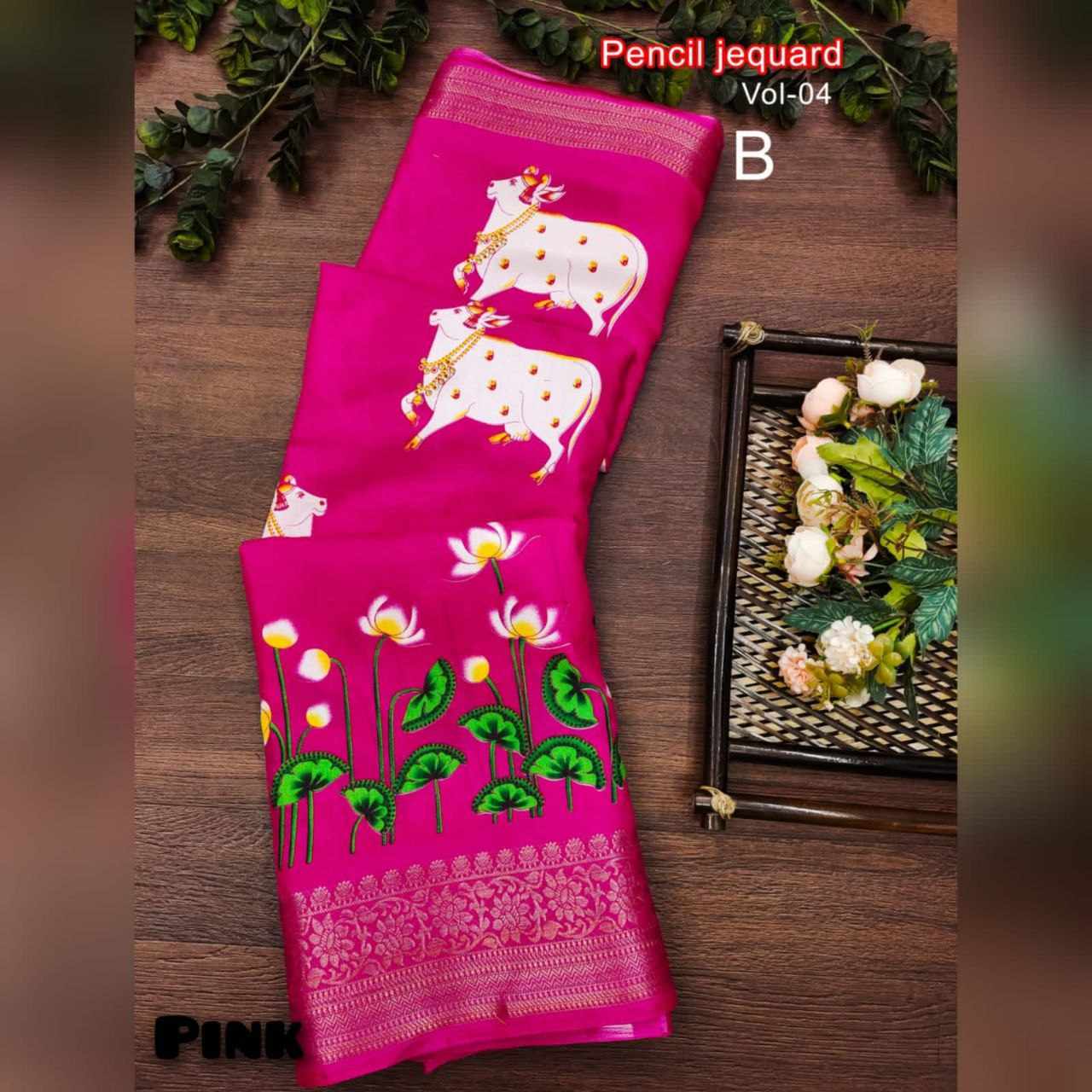 3 Inch Gold Zari Pencil Jacqrad Weaving Pattu Border Hand loom Dola Silk Fabric Digital Flower And Kalamkari Printed Saree