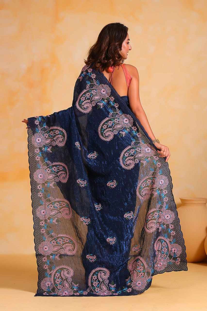 Pure Korean simmer silk saree in a solid color with crushed and manily  embroidery viscos thread work in saree  Paired with  blouse of  same  color of saree with work border