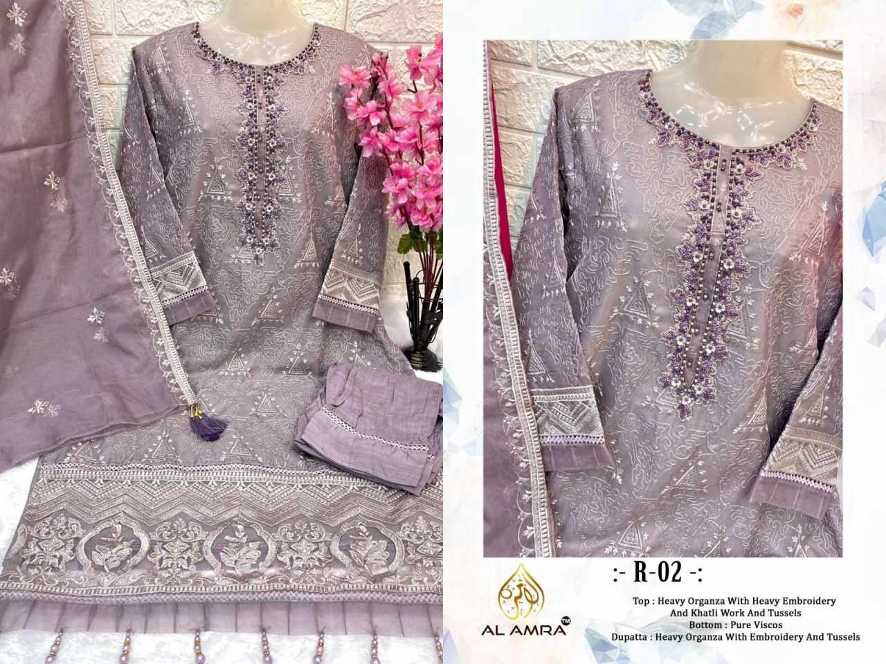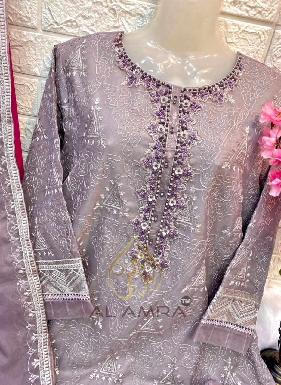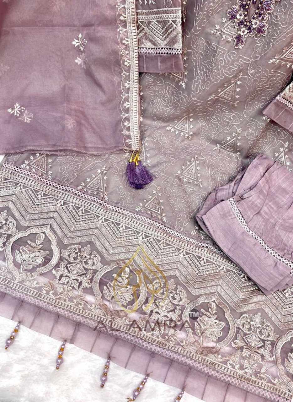 TOP : HEAVY ORGANZA FRONT AND BACK EMBROIDERY WITH INNER SOFT DULL SANTOON AND NECK HEAVY KHATLI HAND WORK