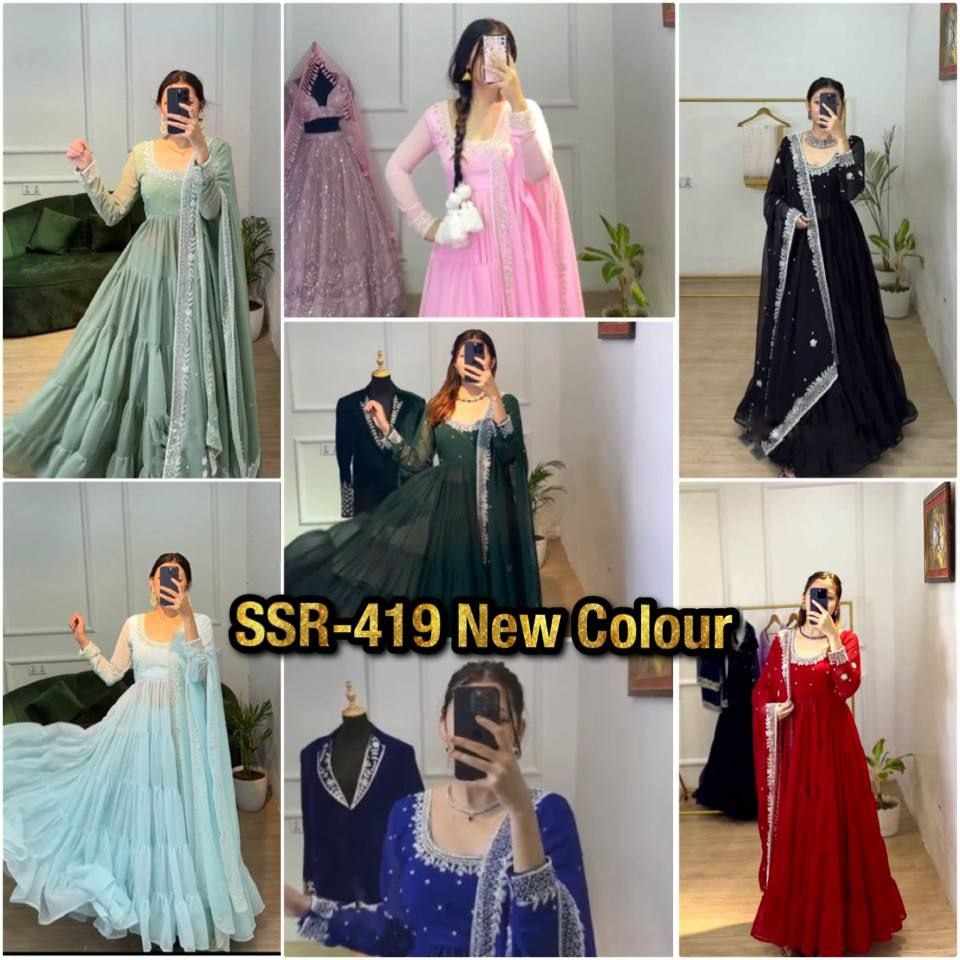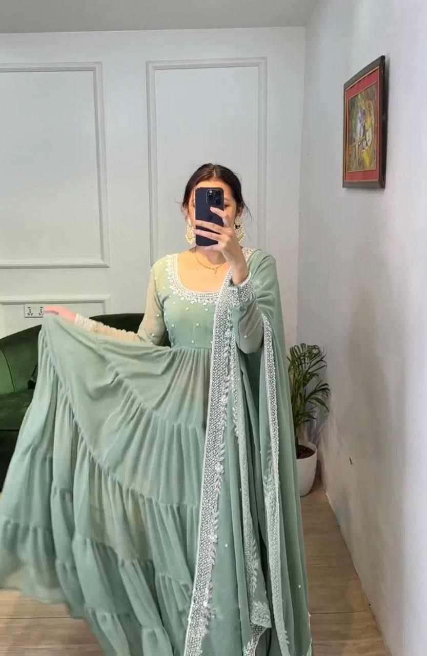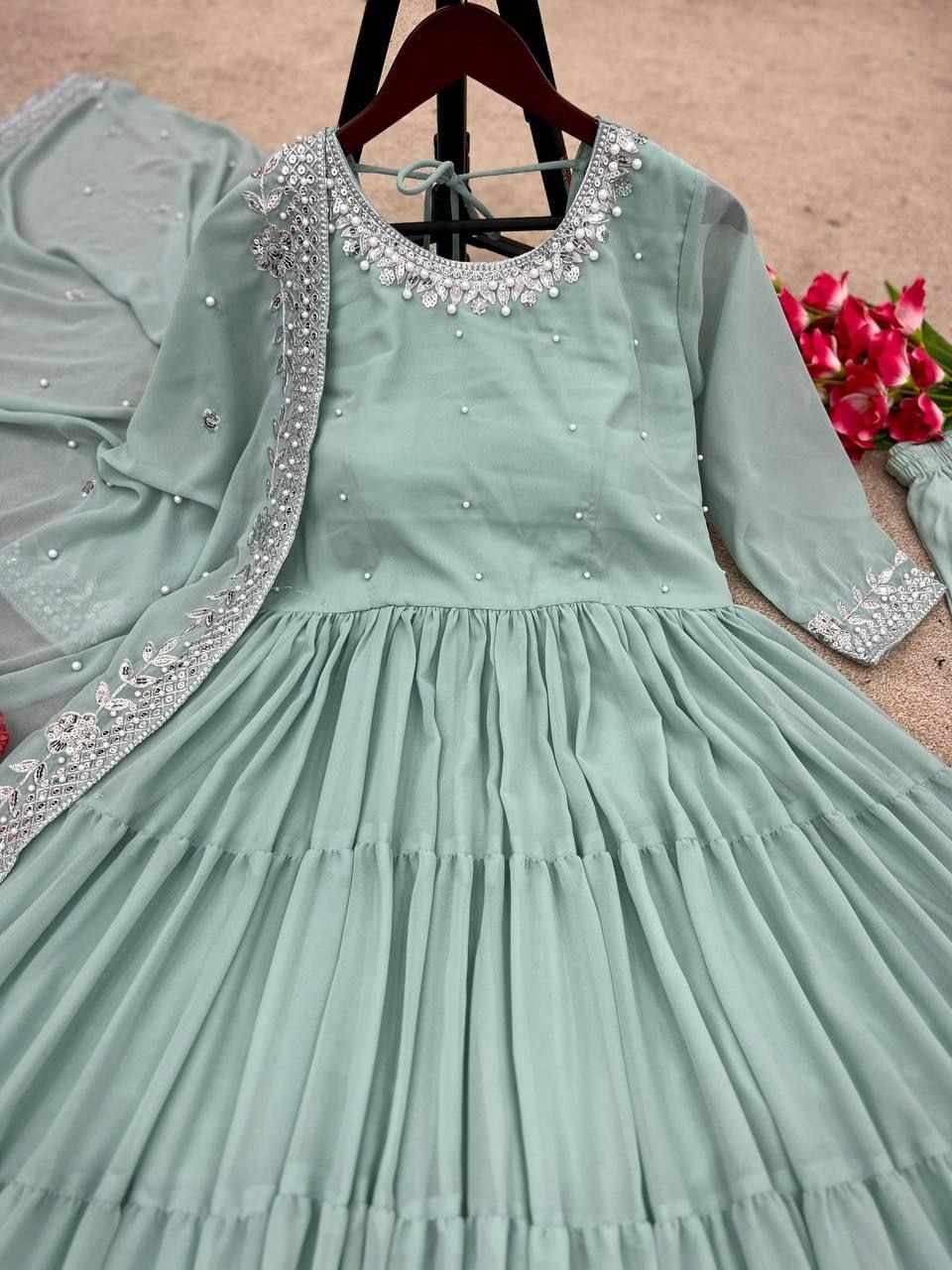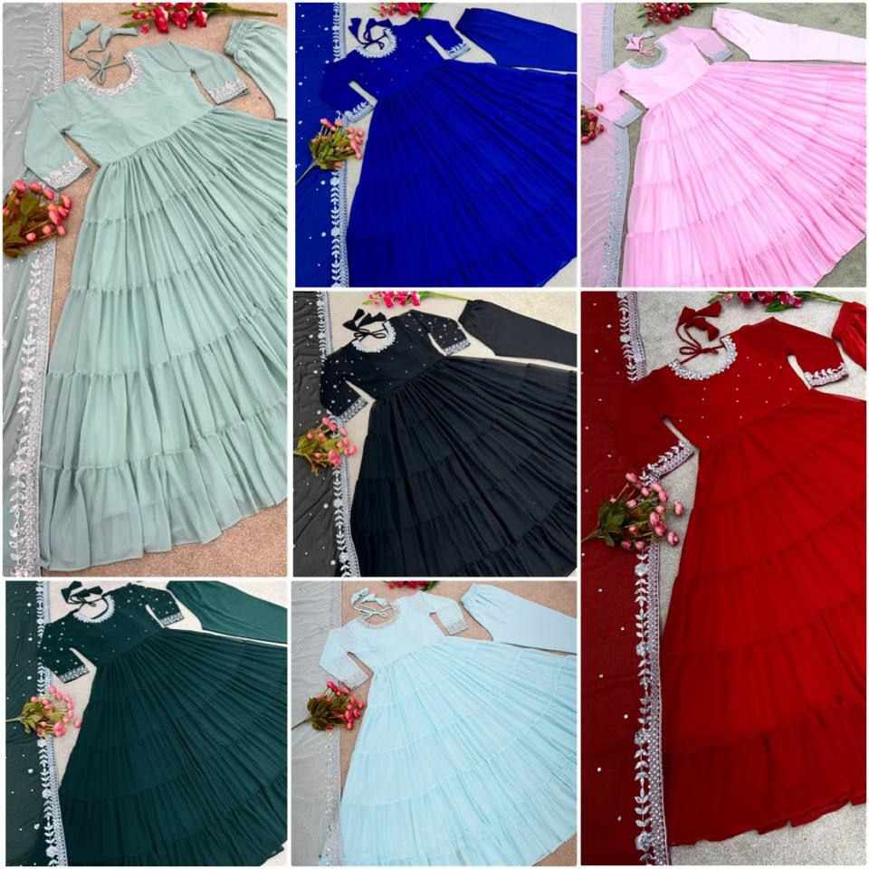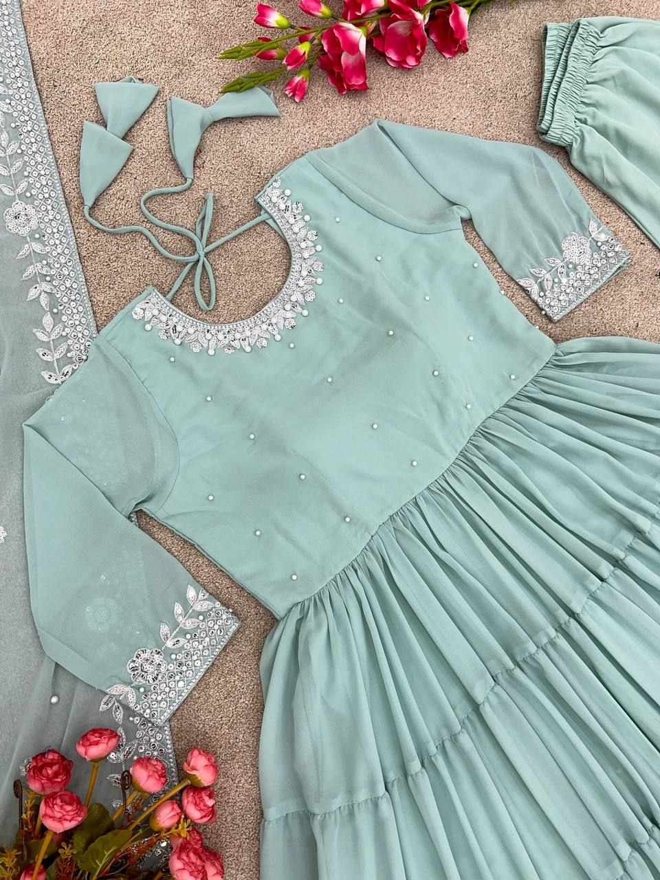 *Top Fabric*:Heavy Georgette With *Embroidery Sequence Work and Rivet Moti Work With attached Pad With Sleeve and *Fully 8 Meter Ruffle Flair*